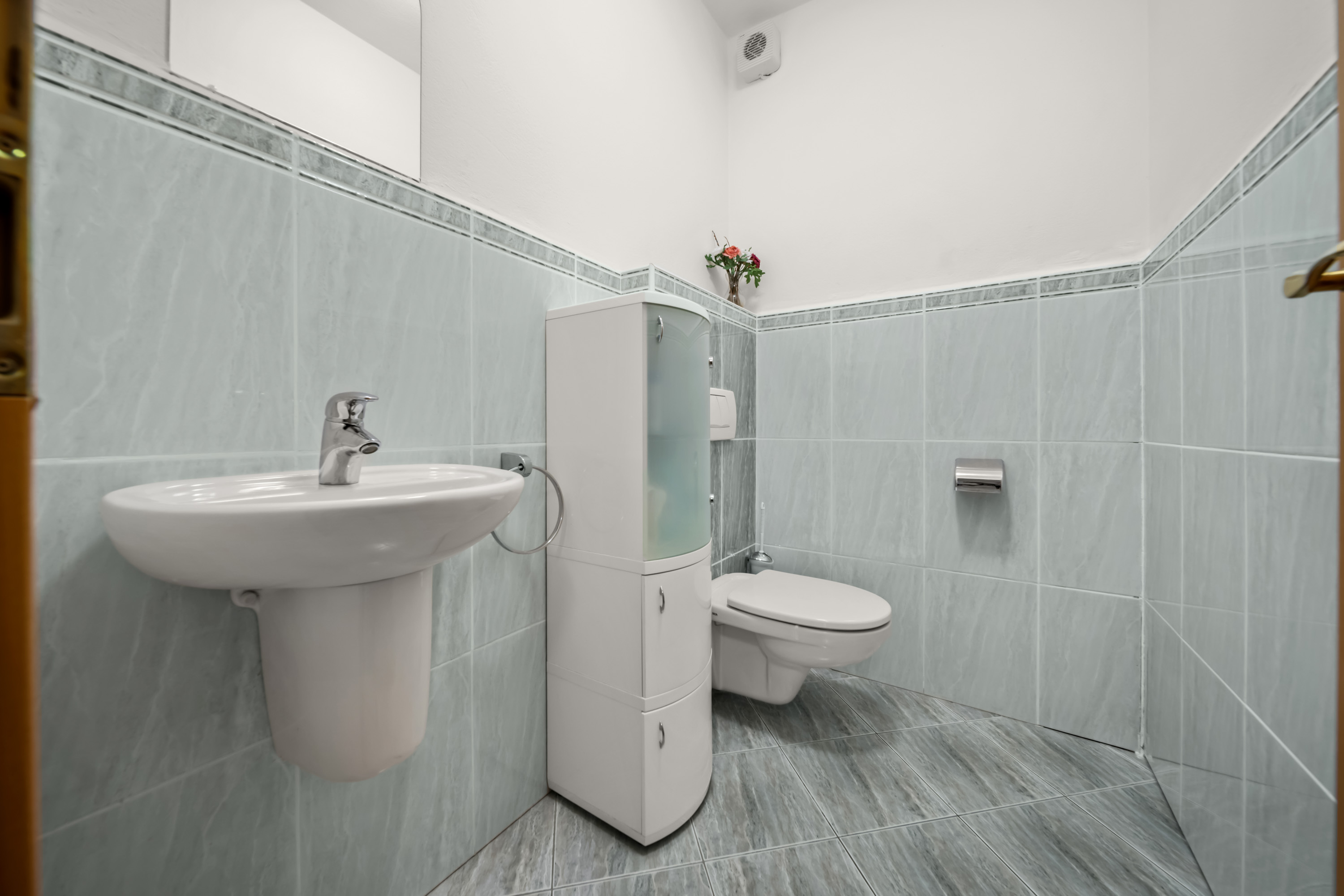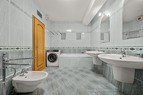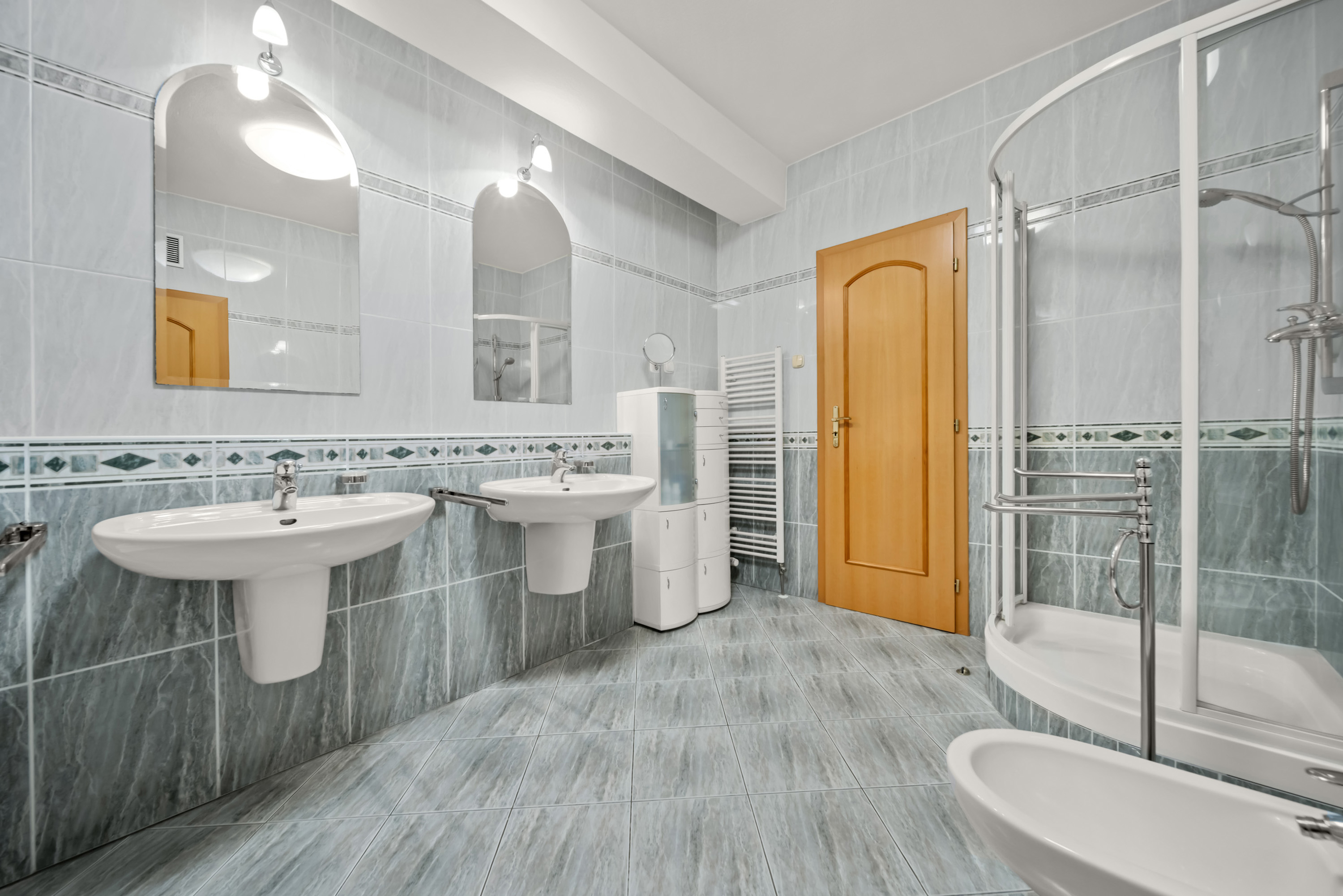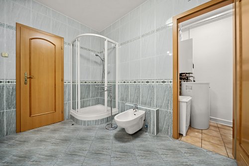Technická miestnosť s vlastným kotlom, priestranná špajza, samostatné WC, veľká kúpeľňa s dvomi umývadlami, vaňou, sprchou a bidetom – všetko tu má svoj zmysel.